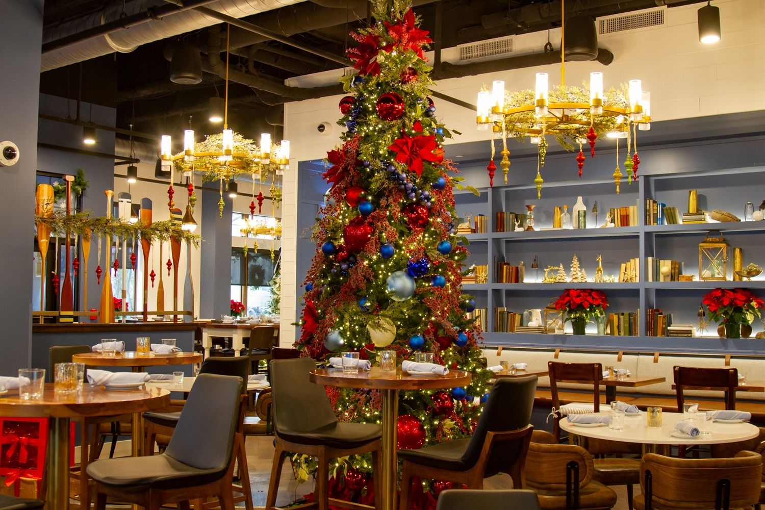 “In keeping with the restaurant's elevated, classic traditional decor, we decorated the main 12 ft. tree behind the hostess stand in all reds and blues with traditional balls, poinsettias, and berry garlands,” said Marie.